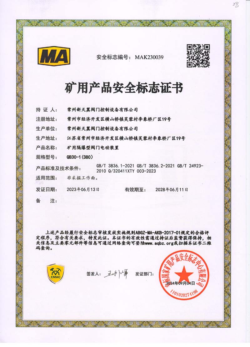 礦用隔爆ZB10-24中國國家強制性產品認證證書110.2